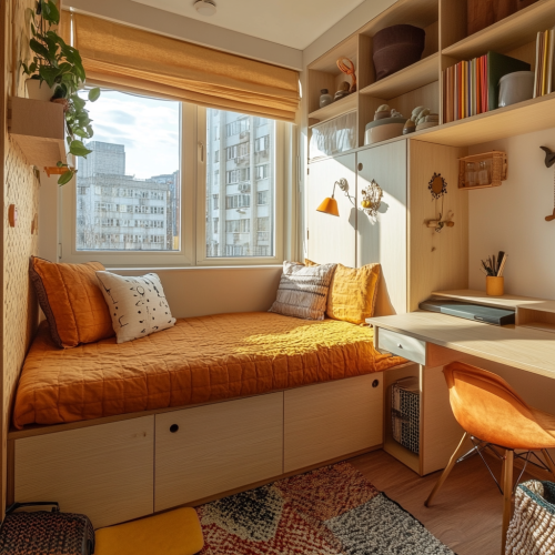 Interior design of a cozy 3x3 meter room, Scandinavian and 1970s-inspired style, compact and functional layout, light wood furniture, minimalist bed with orange and mustard-colored bedding, slim desk with retro accents, small wardrobe for clothes, soft neutral wall colors with vintage geometric patterns, warm lighting, natural textures like wool and linen, touches of greenery, subtle 70s decor items, large window for natural light, organized and open feel –ar 1:1 –v 5