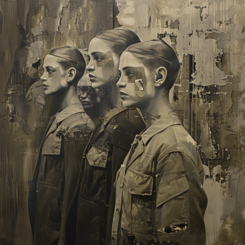 Create an oil painting that merges dystopian fashion with the refined elegance of 1940s photography, combining timeless aesthetics with modern artistic appeal. This image should portray multiple figures, each styled in avant-garde fashion with a slightly militaristic, worn look distressed fabrics, muted colors, and intricate textures. The background should depict a decayed urban setting with retro-futuristic architecture and subtle industrial lighting, creating a sense of foreboding elegance. The composition should avoid simple profile views, instead presenting varied perspectives and interactions between subjects to ensure visual diversity across multiple images. The overall effect should be both vintage and contemporary, embodying a modern, cinematic quality suitable for display at a contemporary art fair. Dramatic lighting and richly painted textures should draw viewers into a world that feels both nostalgic and futuristic, capturing the mood of a refined, yet dystopian, fashion scene --v 6.0