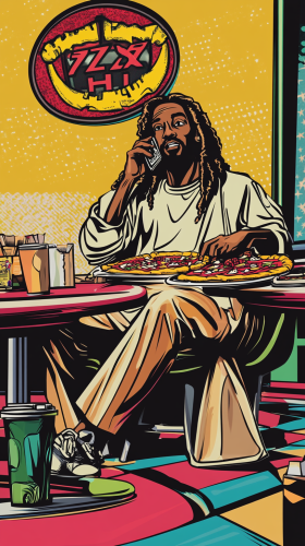 Pop art cartoon of a character resembling Black Jesus sitting in a Pizza Hut, speaking on the phone and enjoying a slice of pizza. The scene includes a bright, stylized Pizza Hut sign in the background. The artwork features bold lines, vibrant colors, and the classic halftone dot pattern often used in pop art, creating a retro yet lively atmosphere. The character exudes a relaxed, friendly demeanor, with a table full of pizza boxes and drink cups to complete the casual setting --ar 9:16