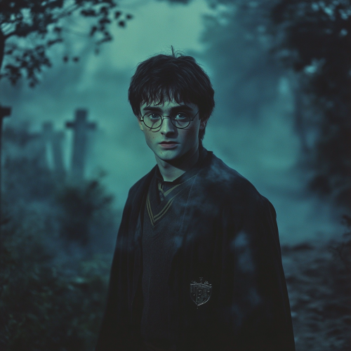 Screengrag of 1950's Super panavision 70 movie. Retro in color. Harry Potter stands in a misty graveyard, wearing a tattered, dark cloak with silver runes shimmering along the edges. His glasses reflect the pale moonlight as he clutches an ancient, glowing wand, surrounded by ghostly apparitions and swirling fog. 9:16