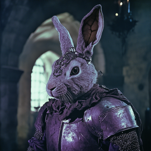 Low resolution screengrab of 1950's Super panavision 70 movie. Retro in colour. A humanoid figure with the head of a rabbit wearing medieval armour. The setting is a dark fantasy world --ar 1:1