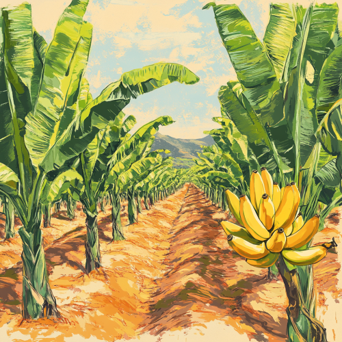 Create a colorful sketch of a banana plantation in a slightly retro style. The scene should feature rows of banana trees with large, leafy fronds and visible clusters of bananas. The colors should have a soft, vintage-inspired feel, with muted yet vibrant tones of yellow for the bananas, rich greens for the leaves, and warm, earthy shades of rusty orange for the soil or background elements. Use a sketchy, hand-drawn aesthetic, with visible line work and shading to give the piece a nostalgic, retro vibe. The overall composition should feel lively and tropical, capturing the natural beauty of the plantation in a style reminiscent of mid-20th-century travel posters or botanical illustrations.