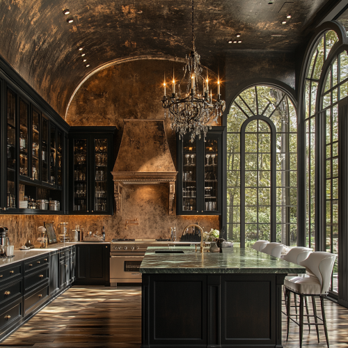 The enormous kitchen has a high vaulted French ceiling made of polished black wood grain, with a large metal chandelier in retro style hanging in the center. The kitchen is designed following the aesthetic of award-winning interior designer Roman Shvom. The walls are covered with French aged black wood veneer, with intricate black French lines. In the center, a vintage green marble island serves as the focal point, with white velvet bar stools surrounding it. The countertops are made of polished black stone, and the space features retro brass fixtures. A large arched window looks out to the outdoor gardens, filling the space with natural light. Ultra-realistic, ultra-high definition. --s 750