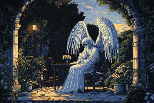 pixel art, game art, 8 bit, an 80s anime-style still depicting a beautiful knight with huge angel wings and a white gown sitting on a small table in a garden at night. The colors are muted pastels, in the style of Yoshiaki Kawajiri, Tsukasa Hojo, Toshihiro Iida, yellow lighting, highly detailed. --ar 3:2