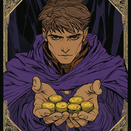 an old school tarot card that has a typical roleplaying game style merchant cupping his hands looking down holding 3 golden coins in his hand resting on top of purple cloth. in a gothic style