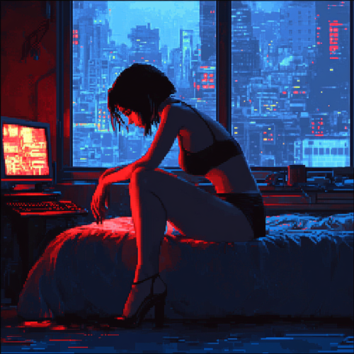 pixel art, game art, 8 bit, bedroom scene, tired woman with short brown hair taking off heels, messy bed in the background, desktop computer lit up in the corner, light coming through a large window with a cityscape, neon red and blue colors, film noir inspired