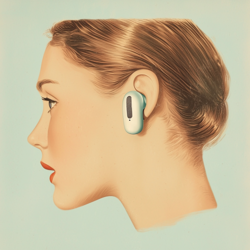 A 1950s-style advertisement featuring elegant women wearing genuine Apple AirPods in their ears, with a retro vintage aesthetic. The women are dressed in classic 1950s attire, with sophisticated hairstyles and timeless makeup. Soft pastel colors and a worn print texture evoke the era’s advertising style. --q 2