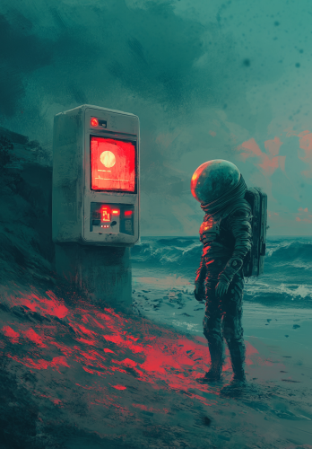 alien standing by the sea, he is standing by an ATM. make the pov from the air looking down. cyan and red hints. warm cold feel, draw style --ar 89:128