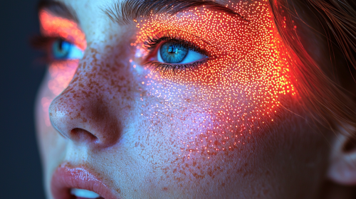 Create a surreal portrait of a figure with an iridescent, futuristic appearance, bathed in vibrant neon colors. Utilize intricate cross-hatching to add depth to the figure's metallic skin texture and unique contour. The character should possess a minimalist expression, reflecting a sense of detachment and mystery, as if from another world. Render the background with minimal detail, focusing on empty spaces to emphasize an eerie, isolated ambiance. Include a subtle, symbolic motif, like a small glint or abstract pattern, to enhance the mystical feel and hint at deeper layers within the figure’s identity.
