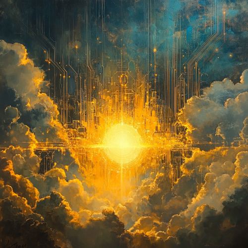 painting for a banking tech campus. Circuitry as a major design element. Light through Clouds. Symbolic of the divinity of technology. Electrical current light flares --v 6.1 --s 250