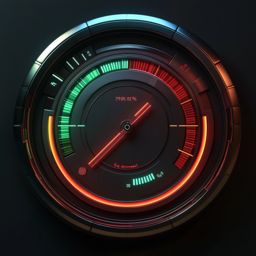 A futuristic radial gauge with a dark, metallic frame, showing the efficiency-to-output ratio of a power plant. The gauge needle and markers are sleek and modern, with a gradient color scheme from red to green. The inner area displays a percentage value in bold, white text, with a subtle glow around the gauge needle to indicate movement. The entire gauge is set against a dark background to match the industrial, minimalistic style.
