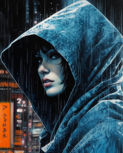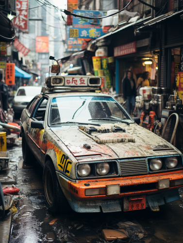 a scene from Blade Runner movie by Elsa Bleda, a biopunk art style, atompunk vehicles, photography in the air, a Spinner vehicles floating between tall skyscrapers, ultra wide angle shot, shot in 35mm film, dense architecture, japan adverts, led, heavy raining, busy megacity, epic, dark after sundawn, reflections, cinematic shot, sharp-focus, high-quality, depth of field --s 1000 --c 100 --ar 3:4