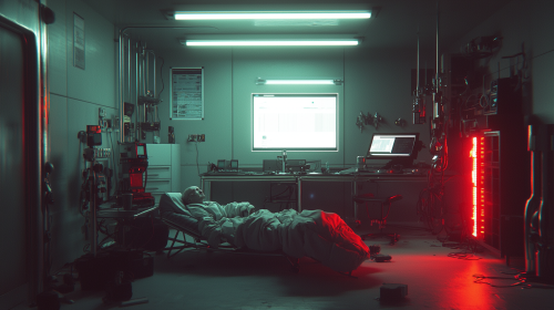 color Screengrab from obscure bizarre 1946 sci - fi horror dark fantasy, color sensationalism. large muscular masculine human bald space pirate dripping in red liquid, terrifying, surreal nightmare, horror, b - movie aesthetic, Retrofuturism, rust, highway hypnosis, evil, howling glistening nervous system strangling, holographic medical diagram, mystery, esoteric, steam, unsettling, extremely detailed and clear, supernatural, retrofuturism, wide shot, directed by John Carpenter --ar 93:58 --chaos 25 --s 750 --style raw
