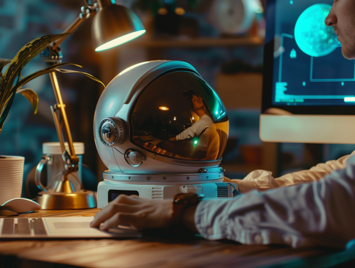 A business owner in casual attire exudes confidence, with a toy astronaut helmet on their desk symbolizing the readiness to explore the vastness of the digital space. The scene implies a hands-on approach and the empowerment to embark on new AI-assisted adventures. Created Using: relatable setting, casual elegance, symbolic representation, ambient lighting, detailed visualization of the desk, clear focus, narrative depth, adventurous styling --ar 4:3 --v 6.0
