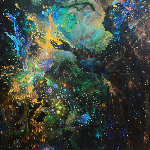 In the middle of the liquid galaxy, there is a forest spirit summoning fire, made of constellations and faceted opals, iridescent, extraterrestrial, retrofuturism, stempunk, integrated art, glowing, photopainting, deep colors, lustrous, sparking, wonder --v 6.0