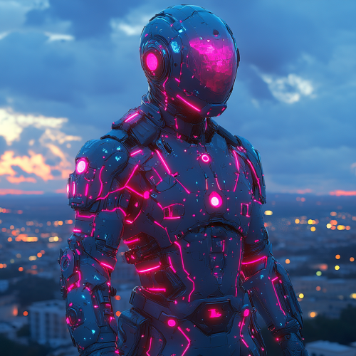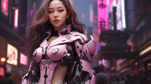korean girl, t pose, pink mecha companion, cyberpunk theme, midriff suit outifit, city --style raw --ar 16:9