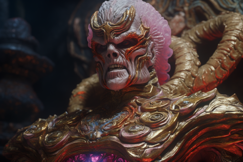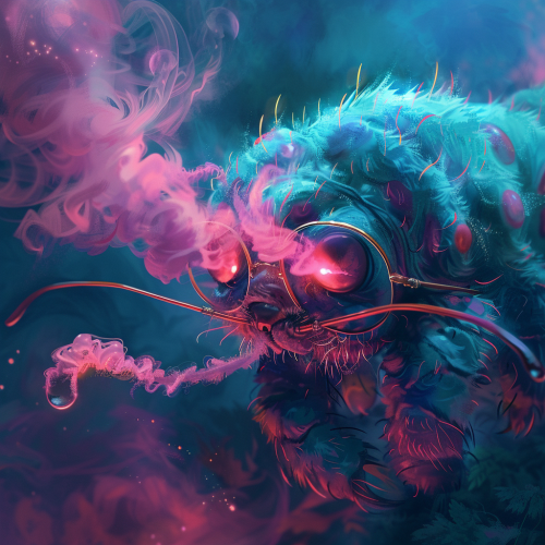 Blue Giant catepillar smoking, pink smoke, Red glasses with gold, thick acrylic illustration guweiz, bright, muted, cinematic rim lighting, dark cinematic, 8k, best quality, ultra detailed --v 6.0