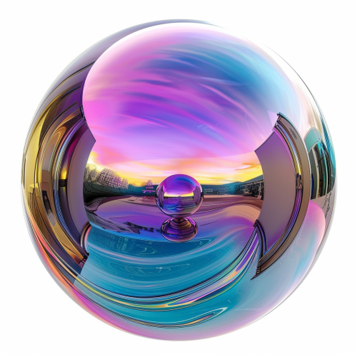 a perfectly round 3D orb with a transparent PNG background, super metallic and reflective surface with a goniochromism / iridescent finish reflecting a liminal space --v 6.0