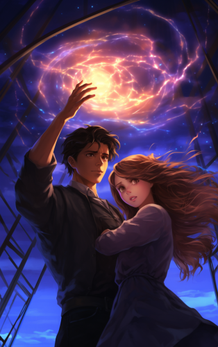 anime scene a man holding a woman in an overhead lift as she points a hand toward a swirling portal of purple light. she has long golden brown hair and yellow eyes. he has dark wavy hair and blue eyes, --ar 5:8
