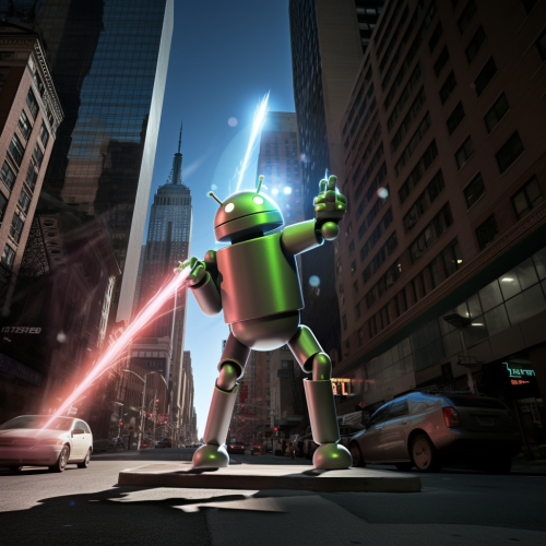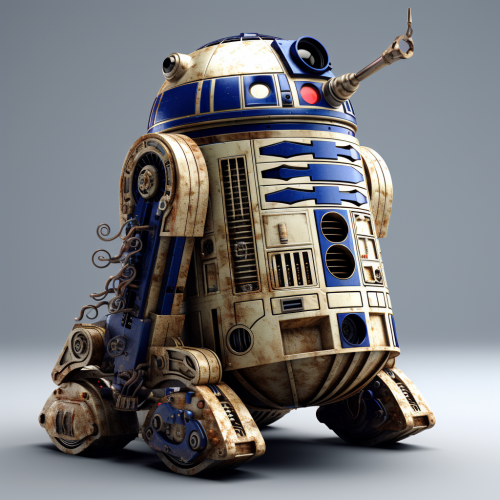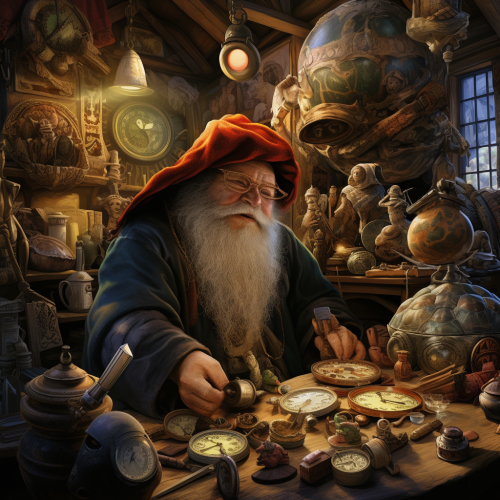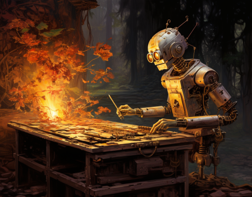 a simple automaton robot using a lazer to create small copies of itself, fantasy illustration in the style of oil paintings --ar 9:7