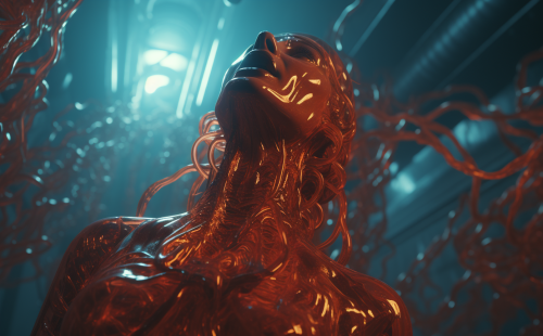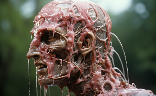 color Screengrab from obscure bizarre 1966 sci - fi horror dark fantasy, color sensationalism. mutant alien zombie freak cyborg robot droid dripping in red liquid, googie, terrifying, surreal nightmare, horror, very absurd, b - movie aesthetic, hillbilly Retrofuturism, rust, highway hypnosis, evil, glistening nervous system strangling the planet Saturn, holographic medical diagram, mystery hole crawling with despair, effigy, occult, necromancer using blasphemous magic, esoteric, steam, unsettling, extremely detailed and clear, supernatural, retrofuturism, colorized, wide shot, directed by Harmonia Vrim --ar 93:58 --chaos 25 --s 750 --style raw