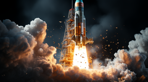 a crypto rocket ship launching to the moon, highly detailed, futuristic, photorealistic, dramatic, optimistic, 32K, UHD, --ar 16:9 --s 750