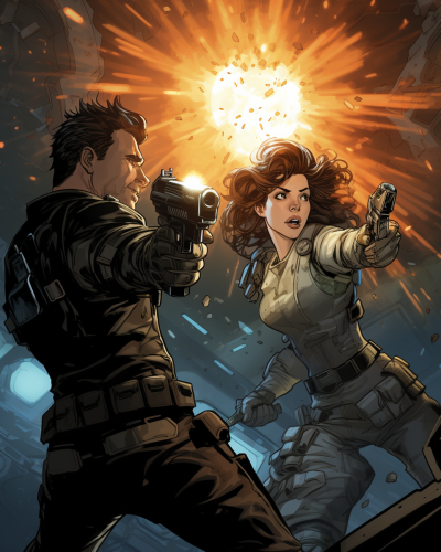comic book illustration of a female tech solder firing her statis ray gun at another bigger soldier, holding him in play, full body image, comic book line art, --ar 4:5
