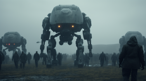 medium shot of a futuristic scene with many enormous sci fi military armored robot army lined up, futuristic android, ultradetailed sci fi parts, fog atmosphere, dark and gritty style, joel robison, minimalist sets, 32k uhd, cryptopunk, unreal engine, ultrarealistic render ultrarealistic ultradetailed, cinematic color grading, dramatic atmosphere, style ridley scott --v 5.2 --ar 16:9