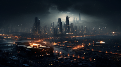 A dystopian scene of a cityscape that stretches to the horizon, with towering buildings reaching all the way into space. It's midnight, and the city is in total blackout, creating a dark, eerie atmosphere. A lone angel with white wings gracefully flies above the city, illuminated softly against the deep night sky. The contrast between the dark, power-less metropolis and the glowing angel adds a surreal and otherworldly touch to the scene. --ar 20:9 --p xwfri5q --niji 6