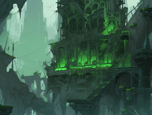 gothic hi-tech ruined city overgrown with toxic green crystal, warhammer 40k, detailed, in the style of dark science fiction --ar 4:3 --niji 5 --s 50