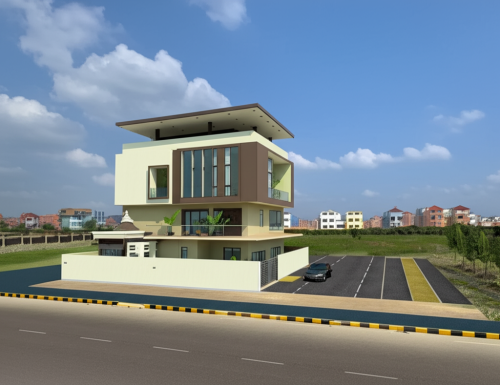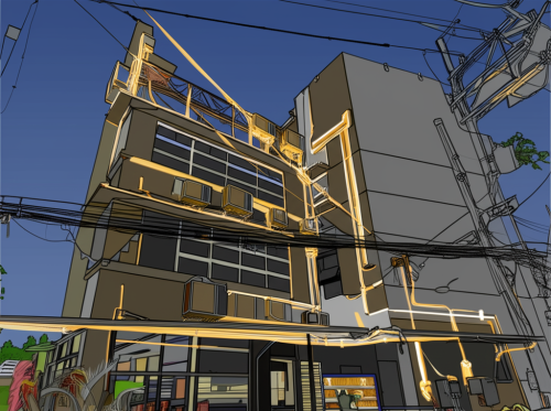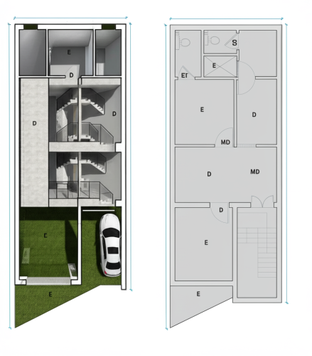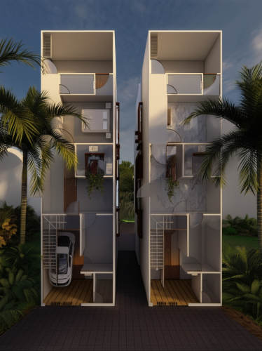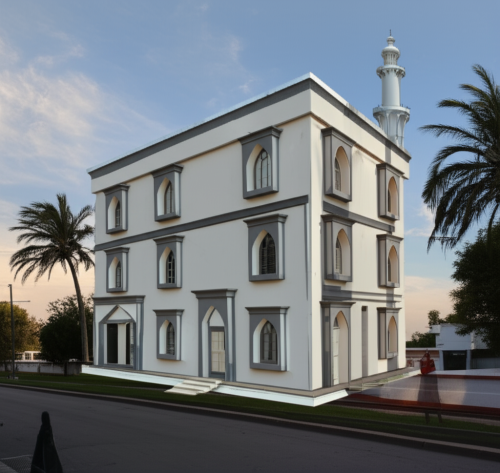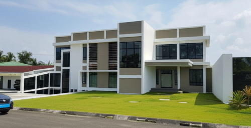 Modern design retail building with large glass storefronts and multiple levels.The building has a modern architectural style with a curved part. Modern lighting, bright color. Futuristic curved lines. The building is 3 floors, elevator is visible from the street
