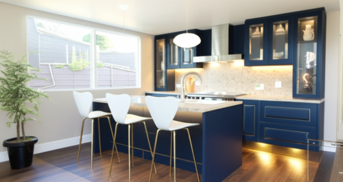 Picture a kitchen in a small beachfront apartment. The kitchen is in a light grey hue with the upper units in a white oak timber finished in a natural oil finish. The countertop is a white marble with grey veins running through it. The hardware in the kitchen is all brushed bronze. The kitchen has a white glass backsplash on all the walls. There is also a brushed stainless steel hob over the stove. The window in the kitchen is white framed and the doors are painted grey. Wooden flooring throughout the space. The kitchen is bright and airy and emphasises the beachfront aesthetic.