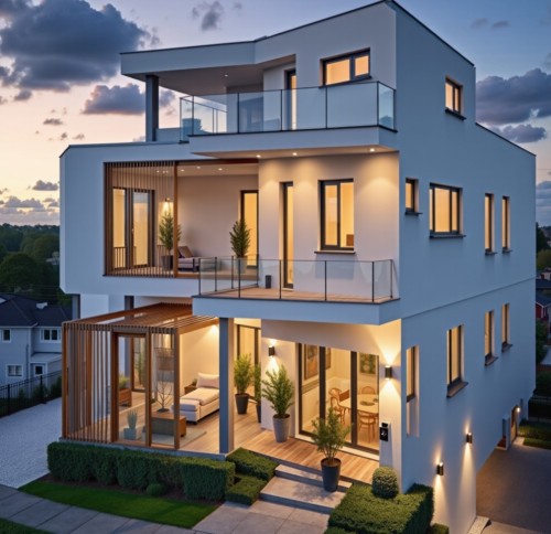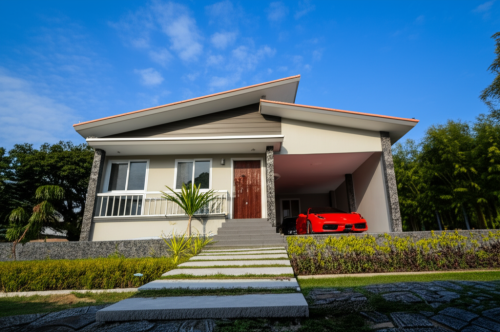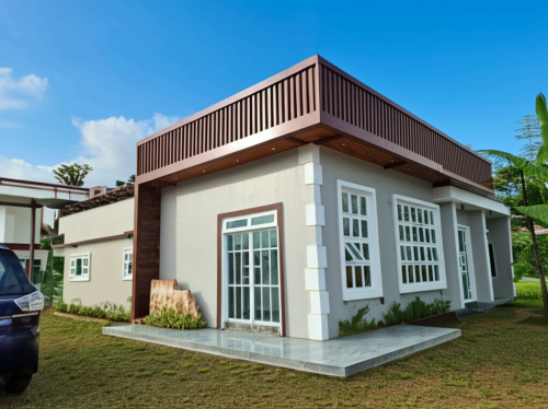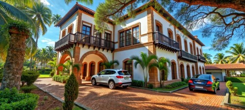 afternoon scene, grey, brown, white color, palm trees, clouds in sky