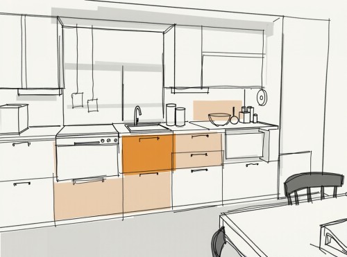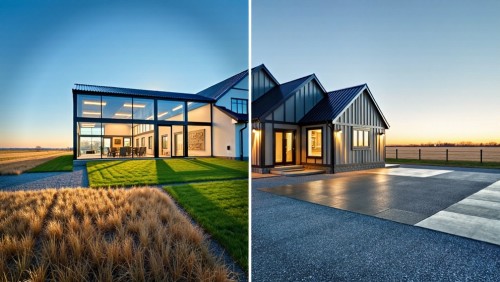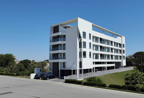 Standalone building in greyish white shade, slab projections in brown colour, window opening in glass with slight glazing, wave like vertical fins for podium in white colour, cityscape landscape, shadows, sky, trees in surrounding