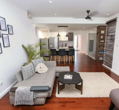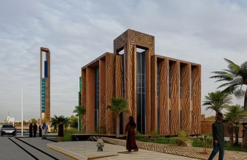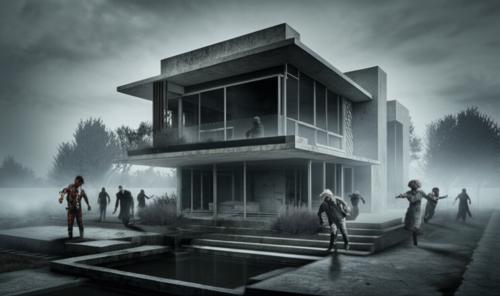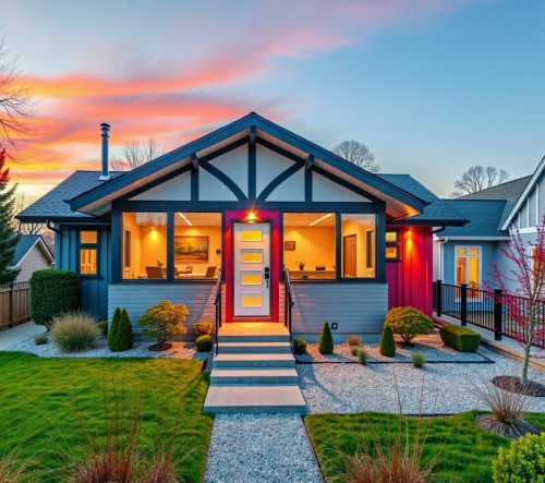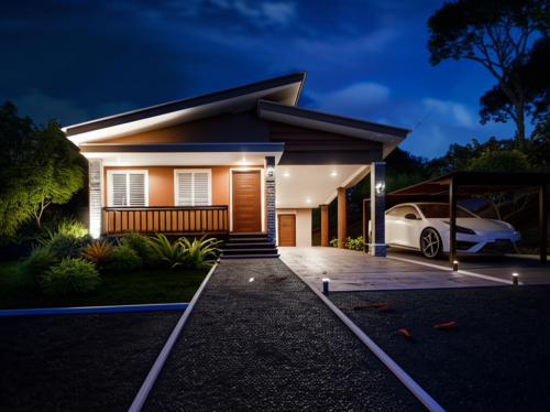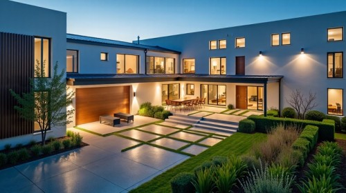 Contempary Gray House design, afternoon scene, extortic and indegenous trees, clouds in sky. Design to remain as is on the sketch