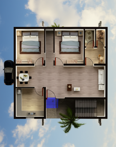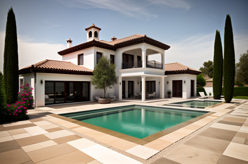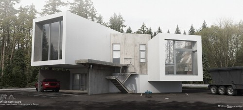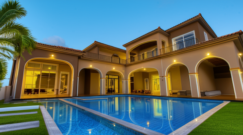 modern home in switzerland, night time, lots of lights, stars, snowing