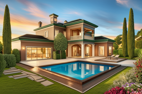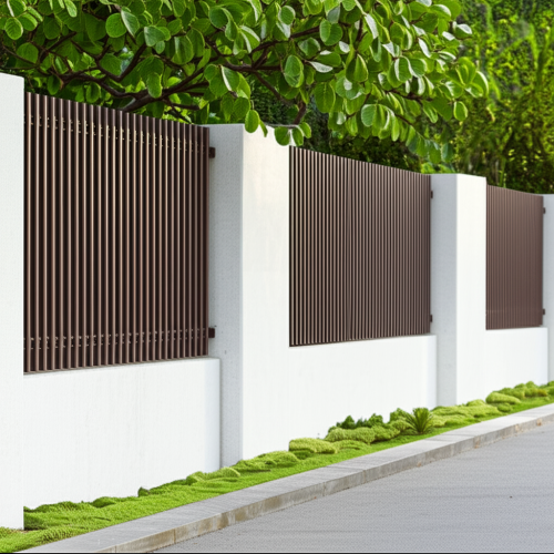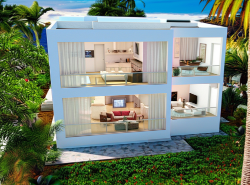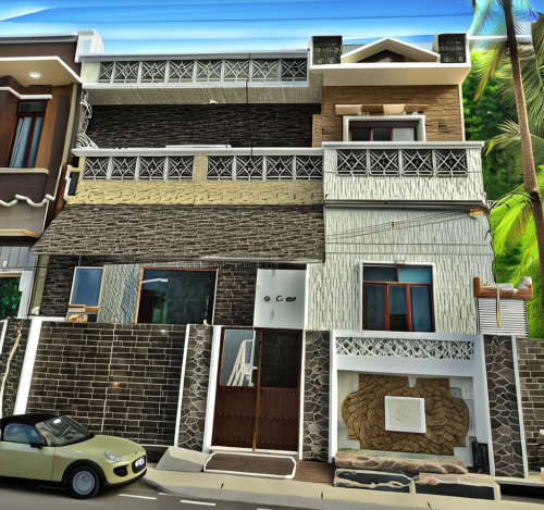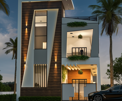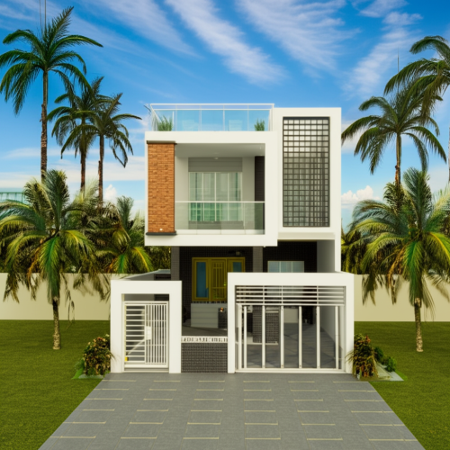 Modern exterior, frontage 22 foot and each floor height 10 foot, afternoon scene, white, grey, brown in colors, coconut trees, clouds in sky, human, road, car, grass, lighting, minimal tiles in exterior