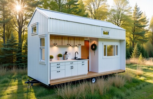 Modern house, wooden roof, yellow walls, afternoon time, cloudy