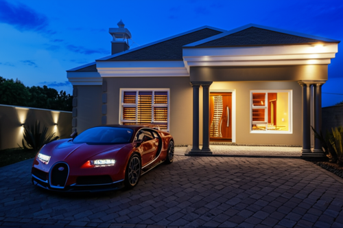 Exterior modern, lighting, human,road, car, minimal tiling, gery, brown and white in color