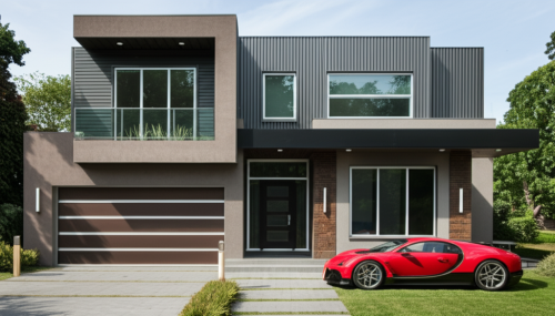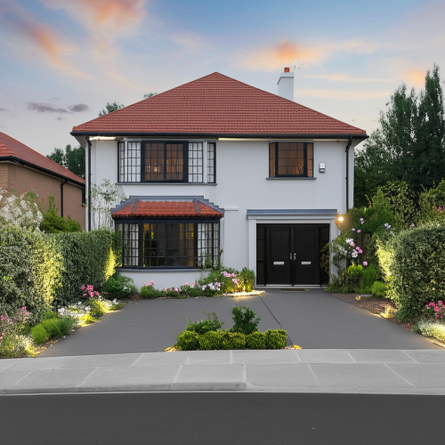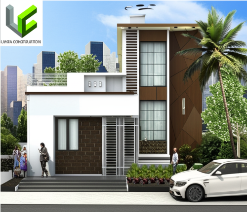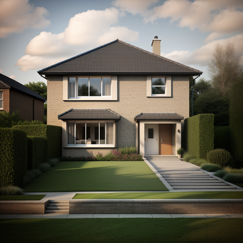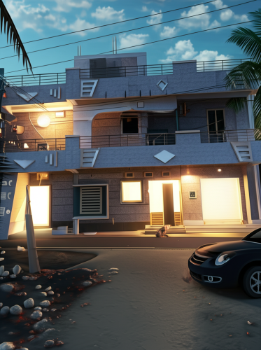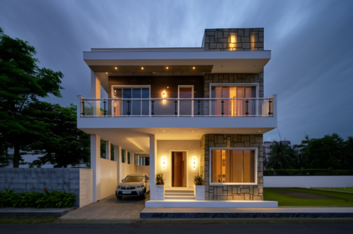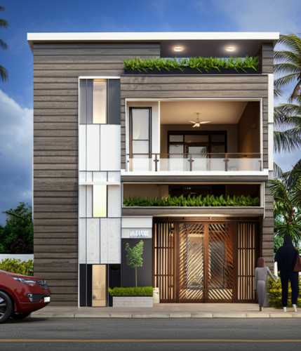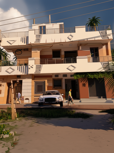 afternoon scene, white, grey, brown color, grass, clouds in sky, human, road, car, lighting, tiles and painting textures, ground floor and first floor only