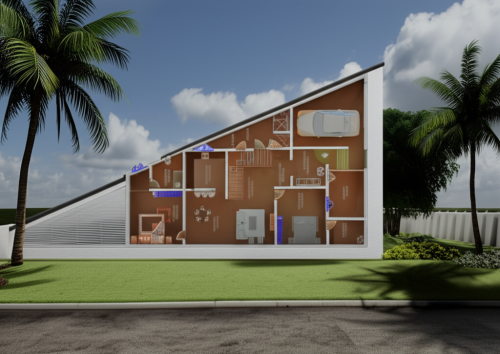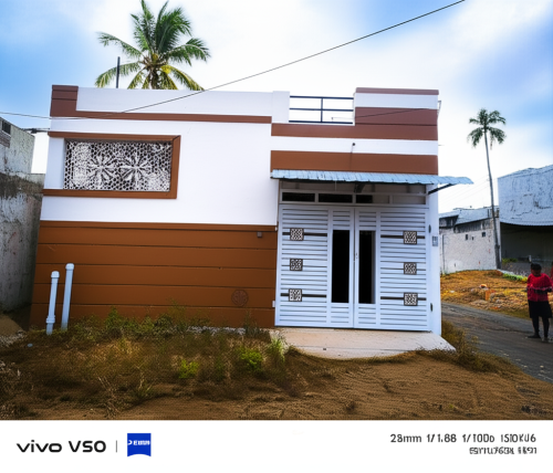 afternoon scene, white, grey, brown color, grass, clouds in sky, human, road, car, lighting, tiles and painting textures