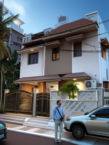 EVENING scene, white, GREY, BROWN color, COCONUT trees, clouds in sky, LIGHTING, HUMAN, ROAD CAR AND A "TMMST MAYYATH QHANA"