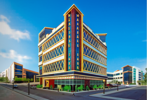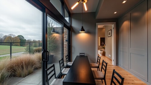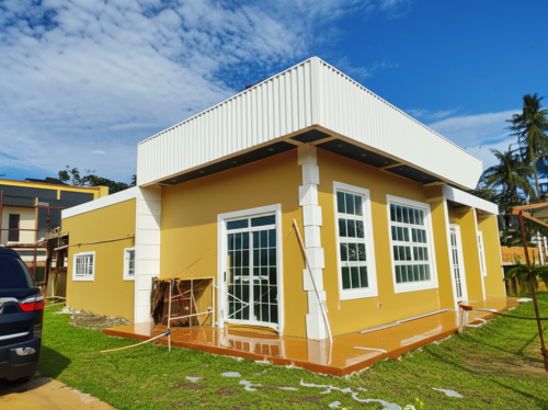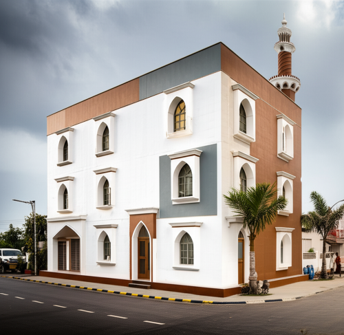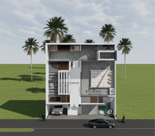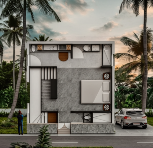 Indian modern, afternoon scene, white, grey, brown in colors, coconut trees, clouds in sky, human, road, car, grass, lighting, minimal tiles in elevation