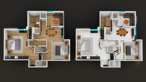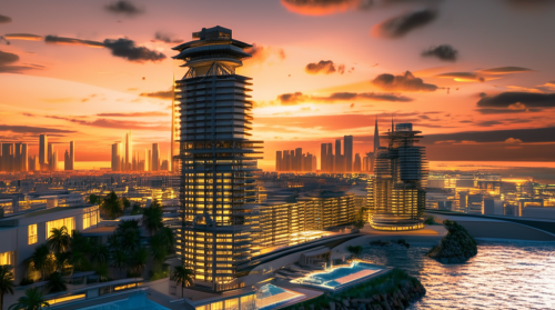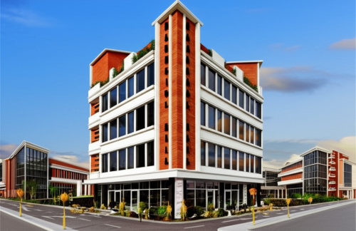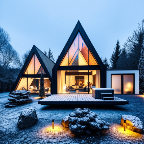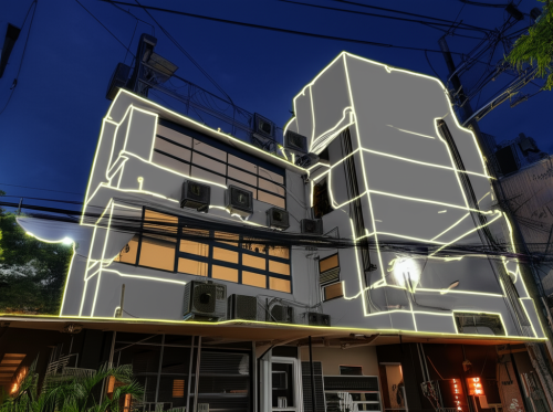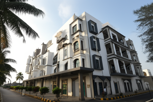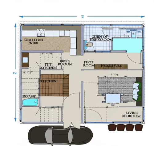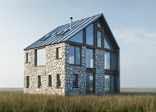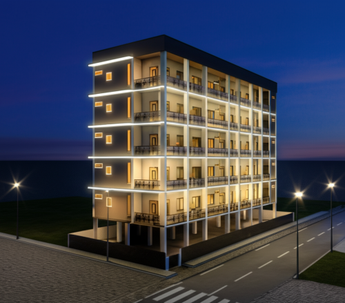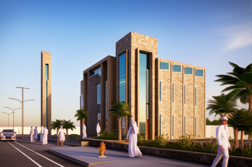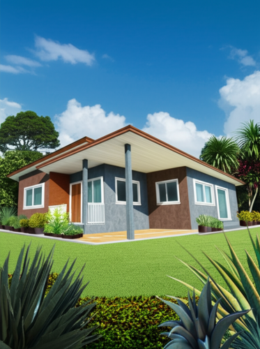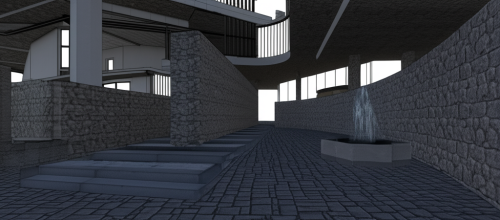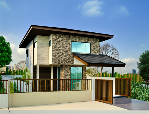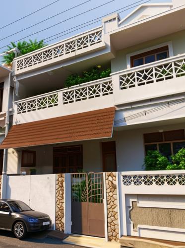 Villa, evening scene, releastic rendering, car near gate, sandstone cladded building