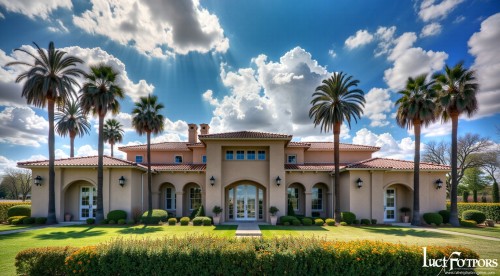 Bright Sunny, City Skyline with sleek walls, surrounded by lush typical garden, coconut tree, people,white, grey and brown