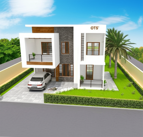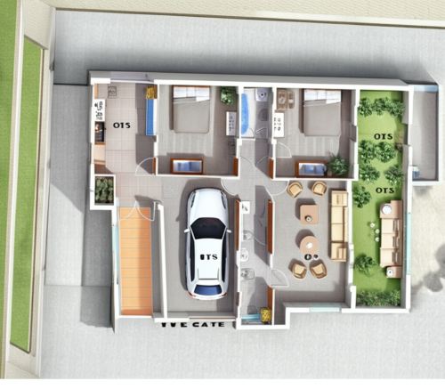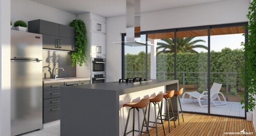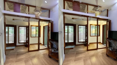 lower walls made of concrete, upper walls white, stone brick paver for floor
