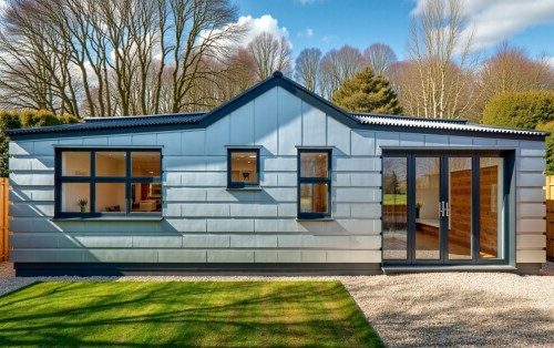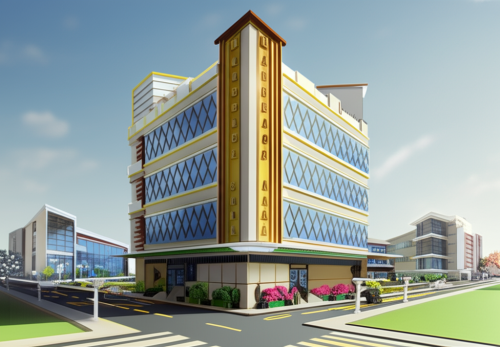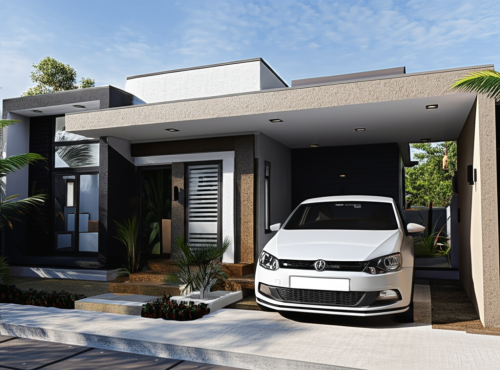 afternoon scene, grey, brown, white color, grass, road and car, human in balcony and main entrance, coconut trees, clouds in sky, inside lighting, use minimal tiles in elevation