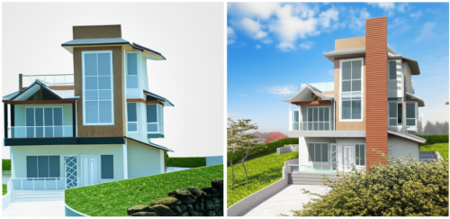 indian Villa, afternoon scene, white, grey, brown in colors, coconut trees, clouds in sky, human, road, car
