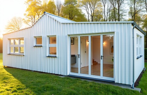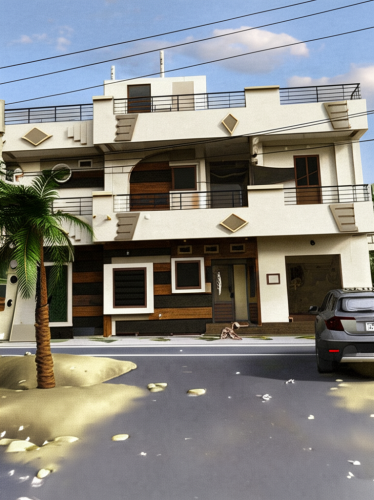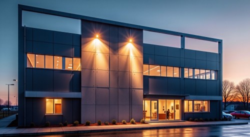 Modern supermarket building in hi-tech style. The facade is made of glass, metal and dark concrete with neon LED lines creating a futuristic effect. The entrance group with automatic sliding doors and stylish LED panel with dynamic animation. The roof is equipped with interactive neon signage, highly visible at night. Stained glass windows with holographic displays broadcasting promotions and discounts. Parking lot with intelligent lighting, creating the effect of soft illumination of cars. The overall mood is technological, stylish and premium