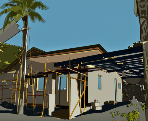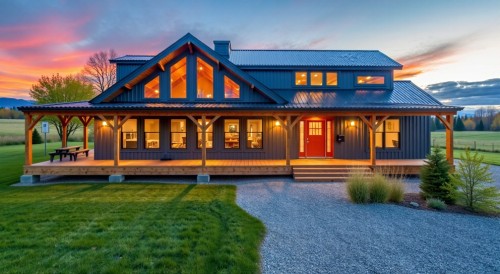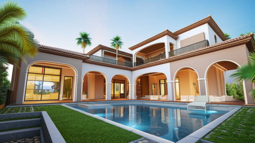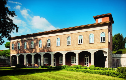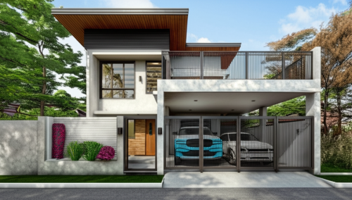 painted walls gray and brown with stone accents,french-style windows with white frame, mouldings along the frame of windows, wood doors, grass, plants and succulents, trees at te back